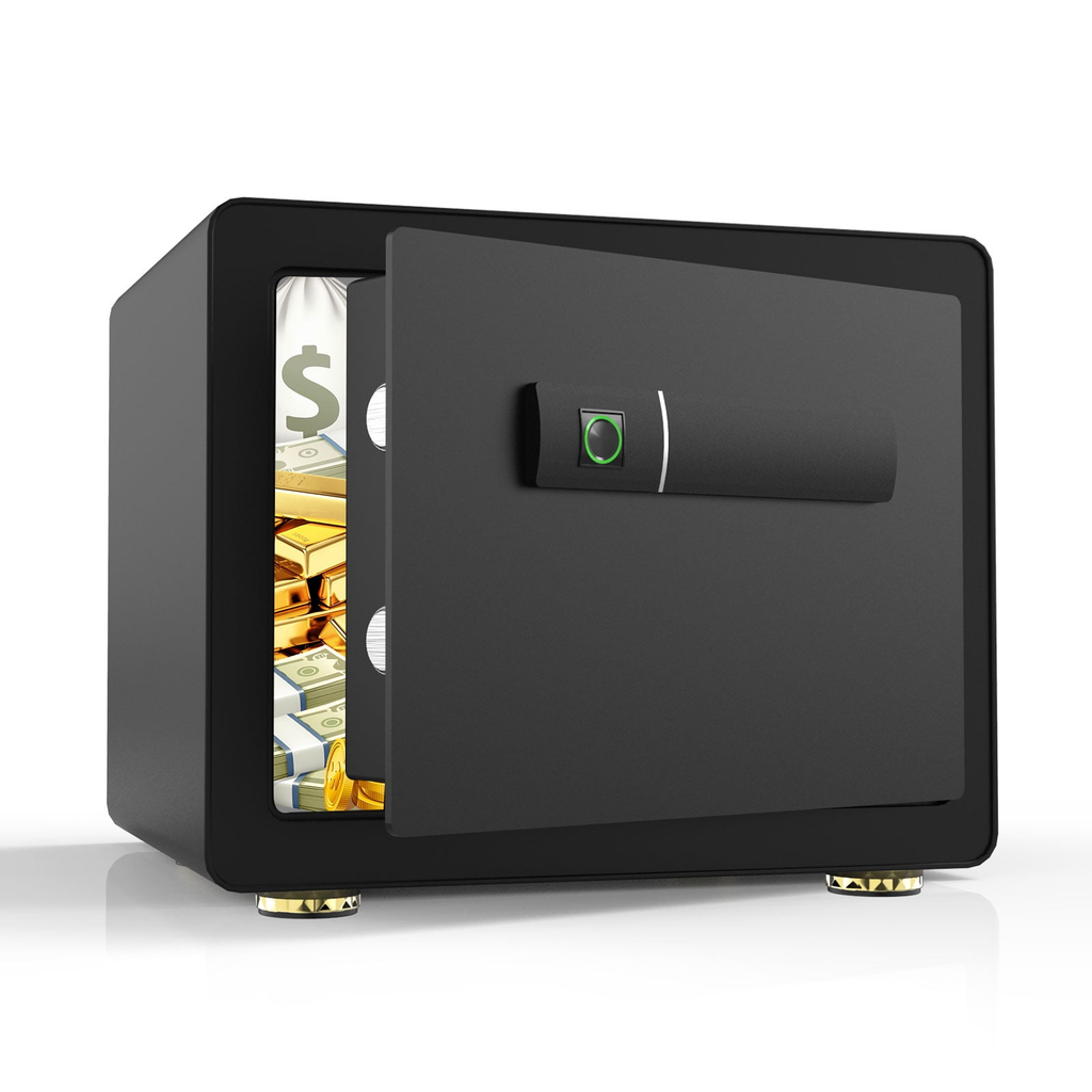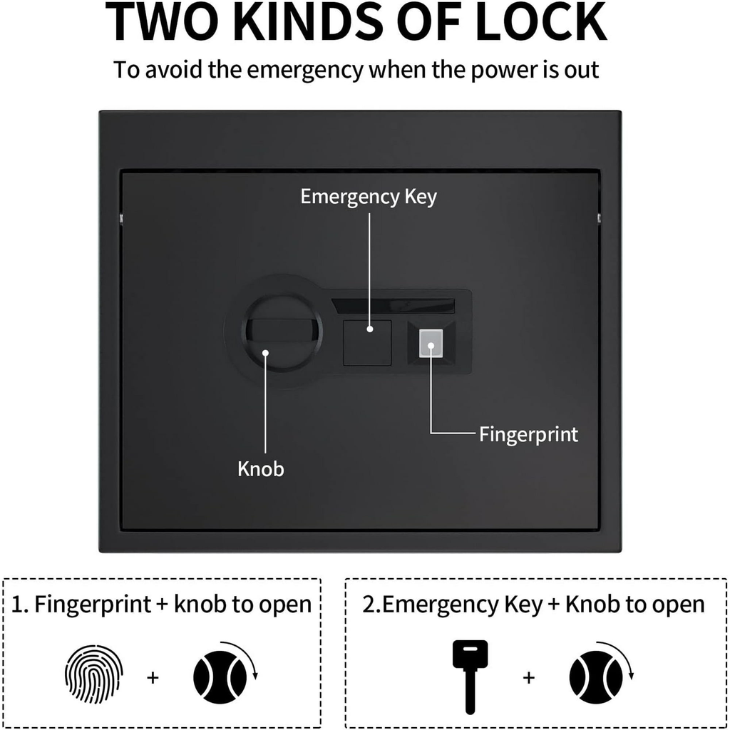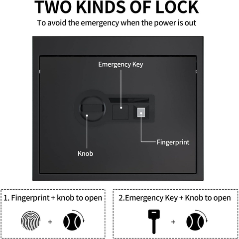 (1)  Fingerprint+knob, you can record up to 20 different fingerprint for opening the safe.