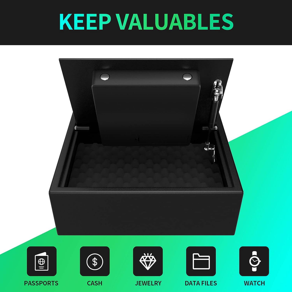 (2)  Key+knob, if you forget the code, 2 override keys can help you. It is equipped with a soft carpet as an additional protective layer to prevent scratching or damage to internal items. A safe with high anti-theft function and the elegant black color will perfectly match the decor of your home, hotel or office and become one of your stylish furniture.