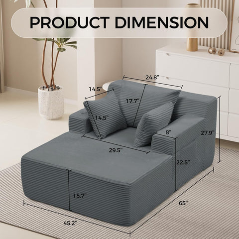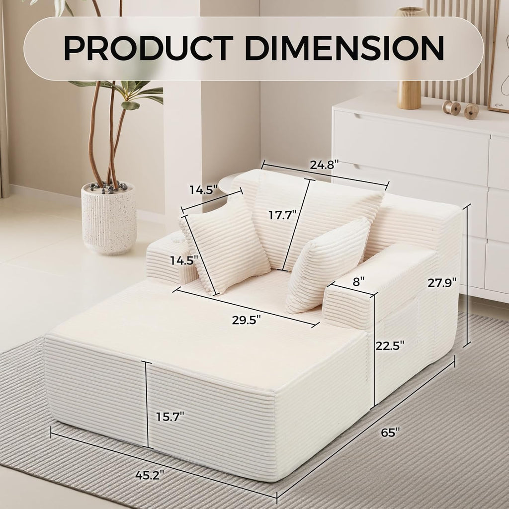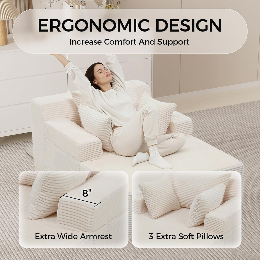 Oversized Comfort - Our oversized reading chair is filled with high-density sponge that perfectly contours to your body's curves, disperses pressure points to ensure exceptional comfort with every sit. The deep seat sleeper couch comes with a backrest pillow and two throw pillows, Whether you're sitting upright, reclining, or lying down, these soft cushions provide the flexibility to relax your way. Ideal for backrest, waist, or head support, adding comfortable support while reading, watching movies, or gaming.